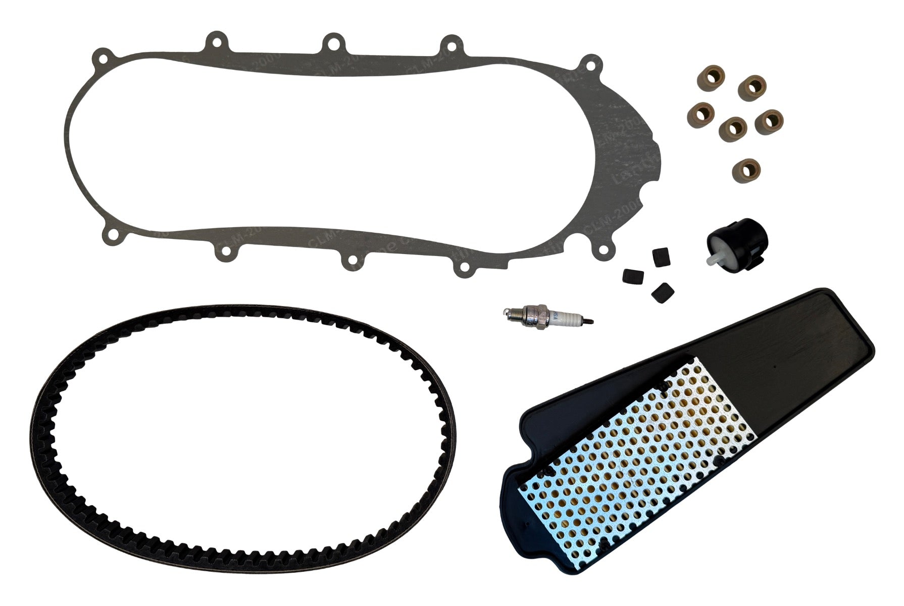 Onderhoudskit bestaande uit: Luchtfilter , Benzinefilter , Bougie , V-snaar , Variorollen set , Vario geleider set en Carterdeksel pakking. Geschikt voor SYM Fiddle III 50cc Bouwjaar 2014-2020 , SYM Allo (GT) 50cc Bouwjaar 2009-2020 , SYM Jet 14 50cc vanaf Bouwjaar 2017 en SYM Symphony ST E4 50cc Bouwjaar 2015-2020