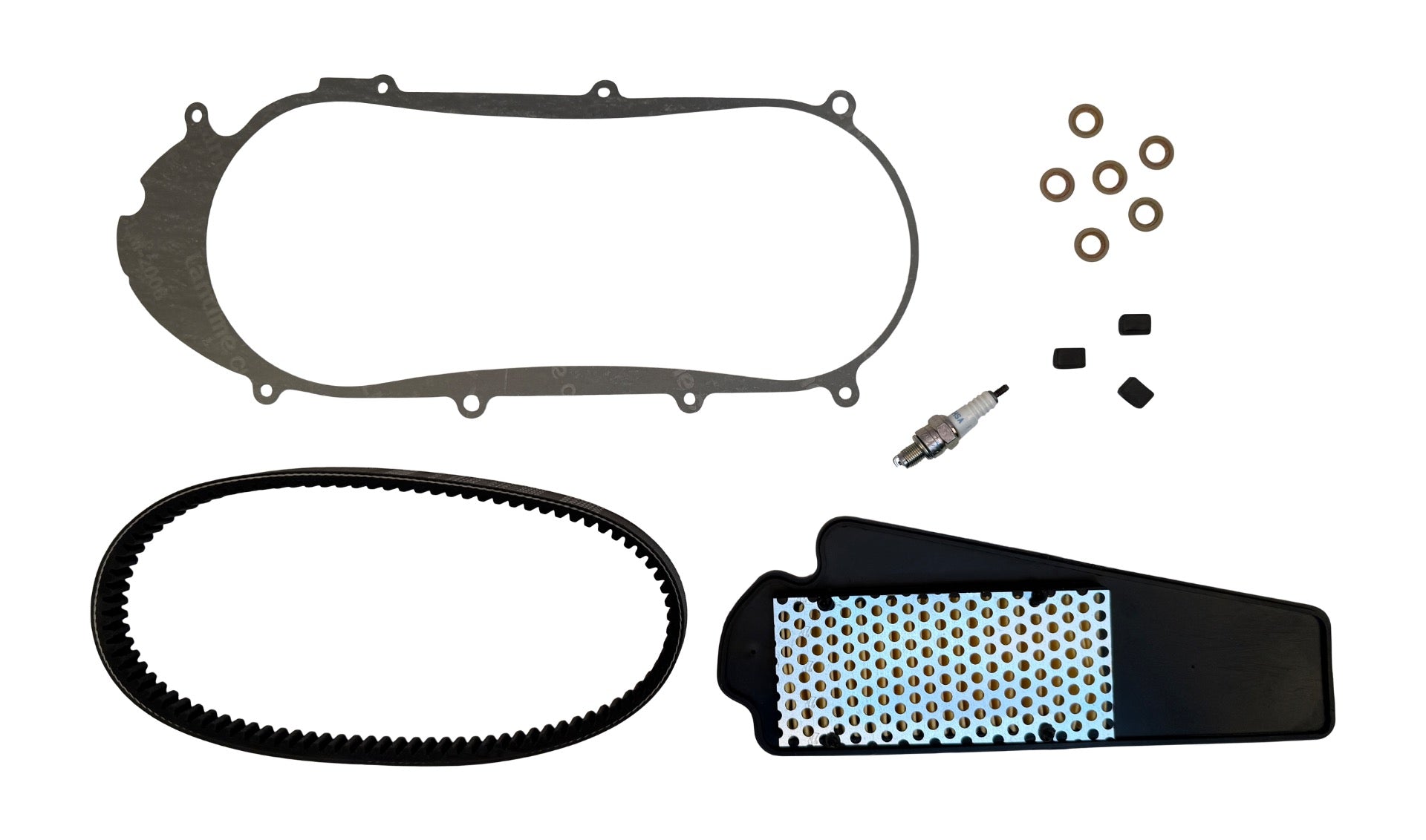 Onderhoudskit bestaande uit : Luchtfilter , Bougie , V-snaar , Variorollen set , Variogeleider set en Crankcase Cover Dichting. Geschikt voor SYM Mio 50i 50cc 25Km Bouwjaar 2018-2020